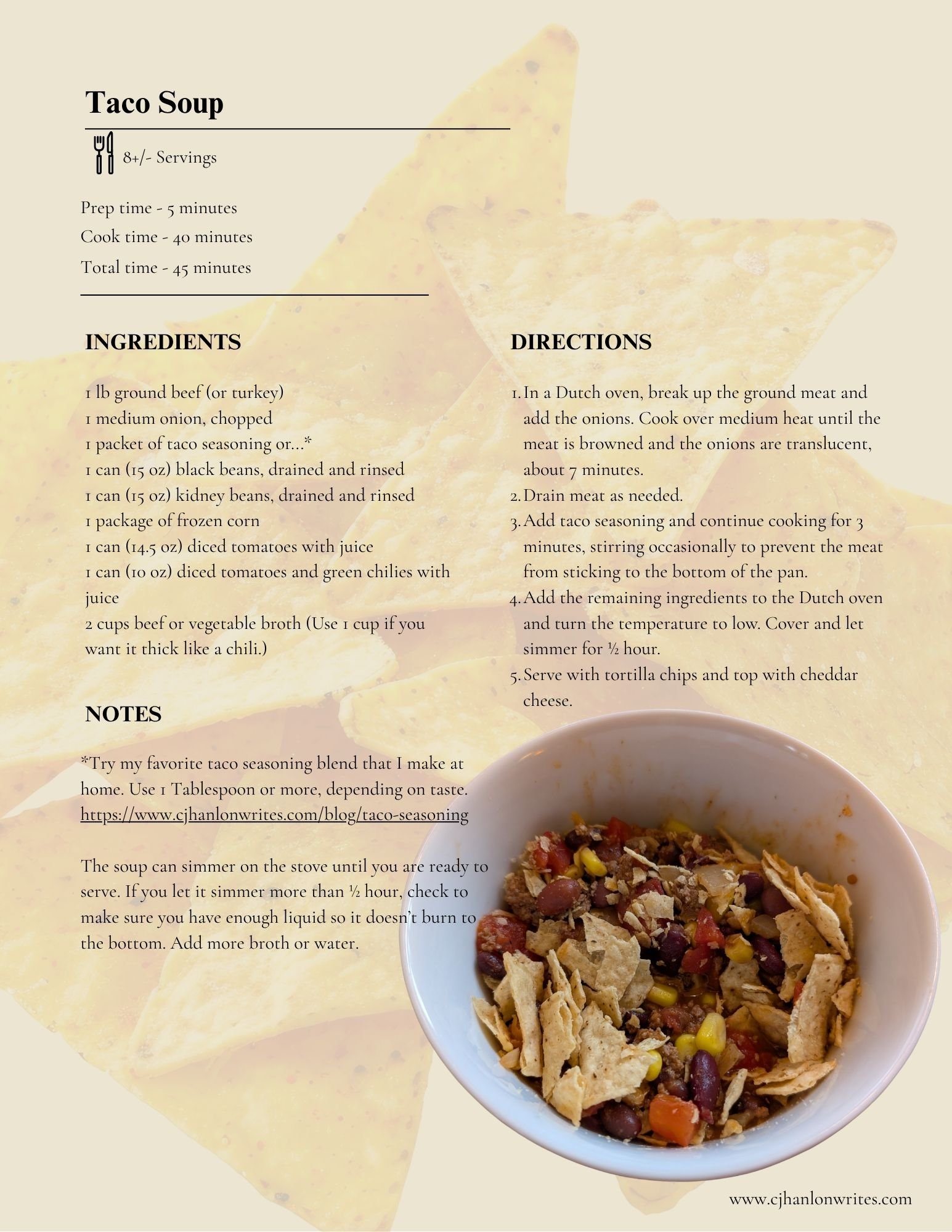 Taco Soup Recipes Sep 30 Written By Christine Hanlon It’s soup season! This recipe comes together quickly and is customizable. Christine Hanlon
